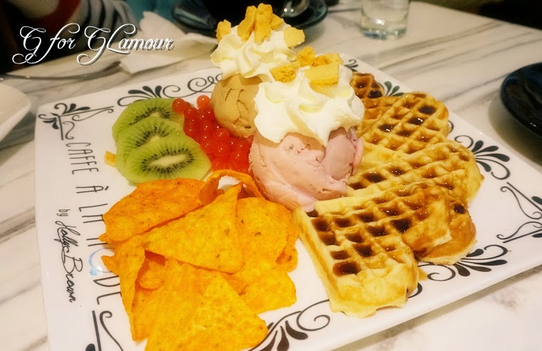 先是這很colourful的Kiwi Surprise 奇異驚喜~ 窩夫是由心形的, 上面淋上新鮮的楓糖漿,兩球大雪糕分別是野莓和咖啡口味, 加上的配料有薯片, 忌廉, 焦糖脆脆, 爆爆珠, 很特別的配搭呢, 口感好豐富, 加上雪糕和窩夫一冷一熱, 還有熟透的奇異果, LIKE~